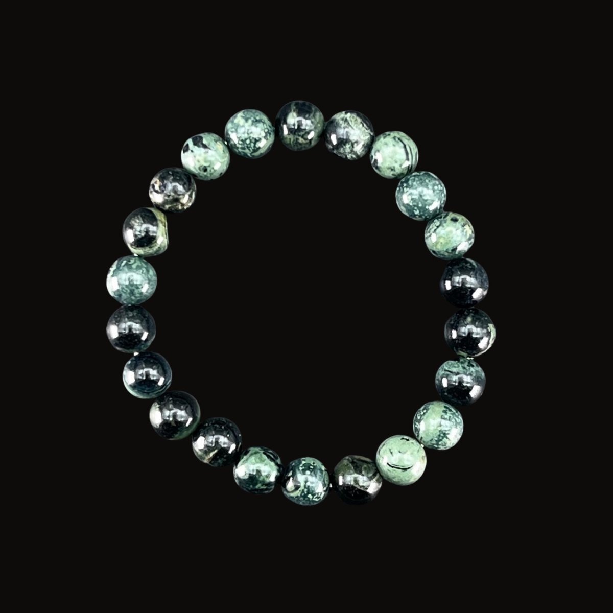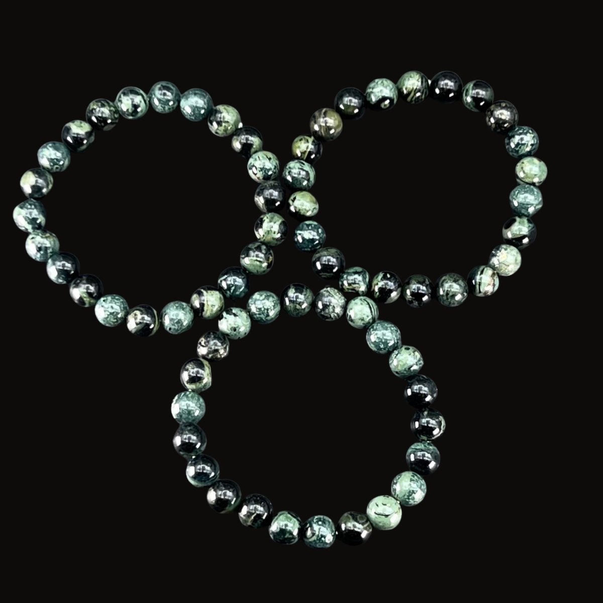 Kambaba jasper is not a genuine jasper; it is instead a variety of porphyritic rhyolite, a volcanic rock that contains larger inclusions in a fine-grained matrix. The bulk of kambaba jasper is green, consisting of aegirine and albite with small inclusions of potassium-based feldspar, and the round black inclusions are riebeckite. Due to its resemblance to the animal skin, kambaba jasper is sometimes also called crocodile jasper.