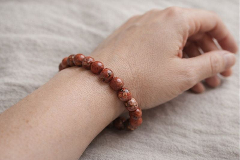 Jasper is an aggregate stone, formed from combinations of quartz, chalcedony, and other minerals that all affect the resulting colors or patterns that form. Red jasper takes its color from heavy iron inclusions. Brecciated jasper forms when jasper deposits break apart then meld back together over time, which can result in angular inclusions and banding.